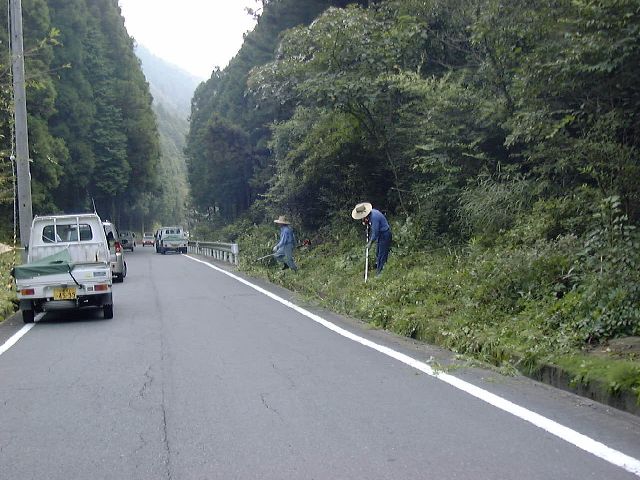 夏には、みんなで草刈りをします。道路は、自分たちできれいにします。